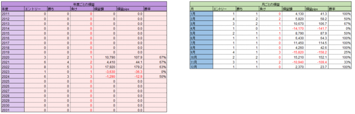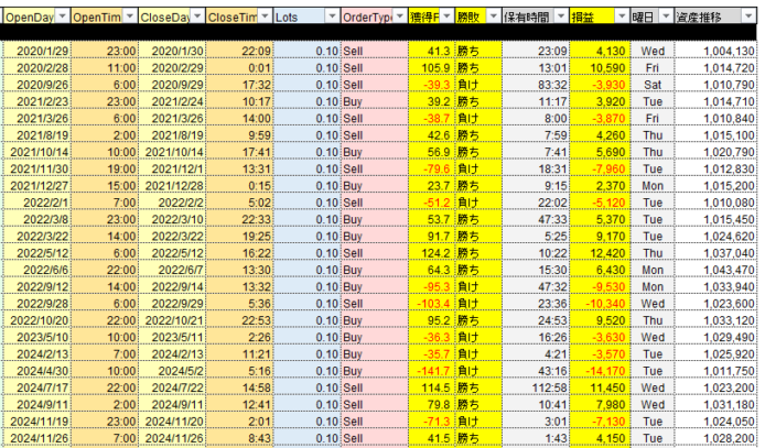 各通貨4年分、5年分でした、リスクリワード1:1、ロットをリスク1%