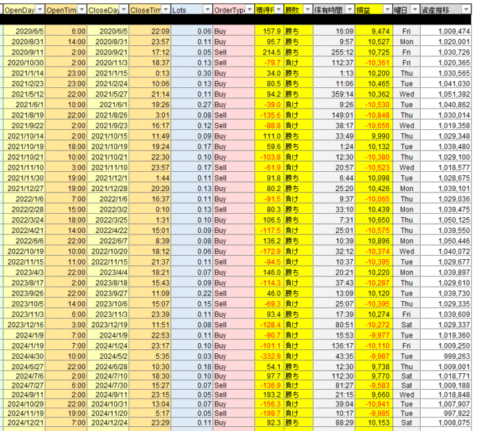 各通貨4年分、リスクリワード1:1、ロットをリスク1%