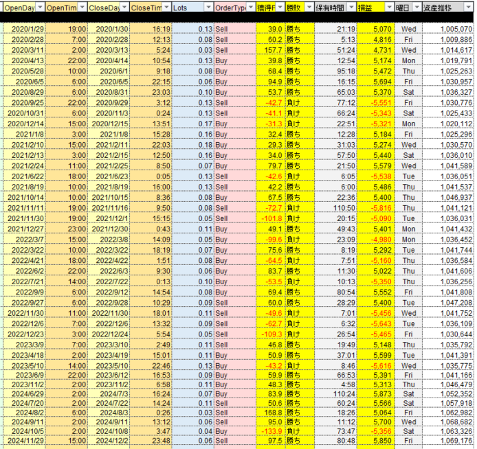 各通貨4年分、リスクリワード1:1、ロットをリスク1%