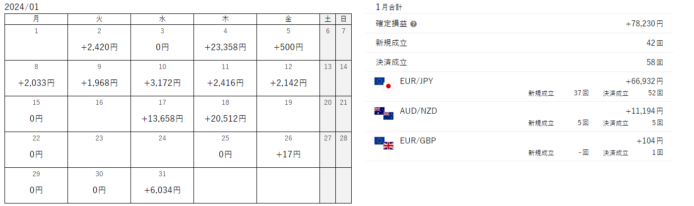 2024年1月運用実績 2024 3/08 トラリピ 月間報告 2024年2月11日2024年3月8日 2024年1月運用実績は、78,230円でした。 今年の目標は・・・、自分にあった手法を見つける事 くるくるワイド、トラリピ戦略等、非常に有効なものだと思いますが、これだけでは億トレーダーになれないと感じています。 根拠をもって損切りができるように習慣づけたいと思っています。 トラリピ 月間報告 よかったらシェアしてね! URLをコピーしました! URLをコピーしました! コメント コメントする コメントをキャンセルコメント ※ 名前 ※ メール ※ サイト 上に表示された文字を入力してください。