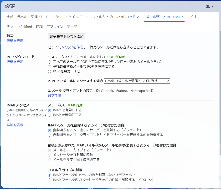 「POP」-「すべてのメール」、「IMAP」-「IMAPを有効にする」を選択します。