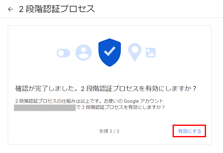 2段階認証プロセスが[オン]になったことを確認し、次の手順に進みます。